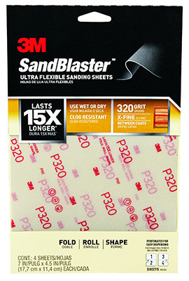 3M Sandblaster, 4 Pack, 320 Grit Extra Fine, 7" x 4.5", Ultra Flexible Sanding Sheets, Sanding Sheets, Feature An Innovative Film Backing So You Can Fold, Roll Or Shape Into Any Form You Need. vendor ID: 38398 Price/Unit: 5.99EA model: 28320SB-UF4