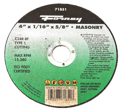4" x 1/16", Masonry Type 1, Cutting Wheel, 5/8" Arbor, Silicon Carbide & Dual Fiberglass Reinforced, Used Primarily On Ceramic, Masonry, Plastic & Other Non-Ferrous Materials, Quality Made To Provide Fast, Safe, Dependable Service, Designed To Be Used On Right Angle Grinders Only. vendor ID: 13649 Price/Unit: 1.99EA model: 71851