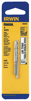 #4 x 40, National Course Thread, Tap & Drill Set, Carbon Steel, Ideal For Routine Maintenance, Repair Work & For Rethreading Where High Accuracy & Tolerance Thread Is Not Critical, Straight Flutes Are Ground To Provide Rapid Chip Removal For Efficient Threading, Designed For Hand Threading Work In A Variety Of Materials Taps Produce A Class 2B Thread, Includes #43 Drill Bit. vendor ID: 2864 Price/Unit: 4.39EA model: 80209