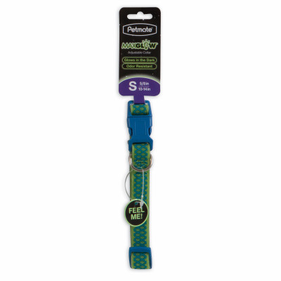 5/8" x 10-14", Green, Grid Pattern, Glow In The Dark Collar, Easy Clean Rubber Overlay, Durable Webbing & Hardware In Complimentary Colors, Self Sustaining, Charges With Any Light Source. vendor ID: 43455 Price/Unit: 10.99EA model: 02391