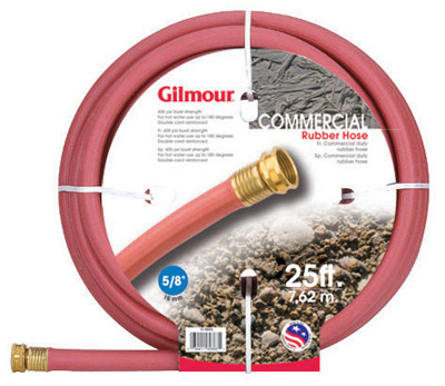 18 Series, 5/8" x 25', Rubber Hose, Reinforced Rubber For Commercial & Hot Water Use, Handles Hot Water Up To 180 Degrees Fahrenheit, 400 PSI Burst Strength, Full Flo Metal Couplings For Unrestricted Water Flow, Double Cord Reinforced, Kink Resistant & Flexible, Resistant To Minor Abrasions & Weather. vendor ID: 48751 Price/Unit: 32.99EA model: 18058025