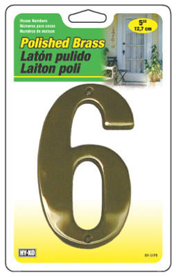 5", Polished Brass, Prestige Series, House Number 6, Weather Resistant, Easily Screws Into Mounting Surface Mounting Screws Included Or Use With Hy Ko Prestige Series Address Plaques, Individually Packaged. vendor ID: 49601 Price/Unit: 8.29EA model: BR-51PB/6