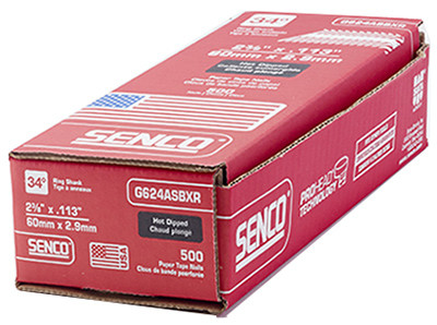 500 Count Box,.113 x 2 3/8" Ring Shank, Hot Dipped Galvanized, Pro-Head Offset Full Round Head, Paper Tape Framing Nail, Will Work Only In Clipped Head Framing Nailers. vendor ID: 168 Price/Unit: 17.49EA model: G624ASBXR
