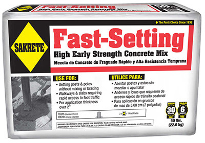 50 LB, Sakrete Fast Setting Concrete Mix, A Mixture Of Portland Cement, Washed & Graded Sand & Gravel & Special Additives Especially Designed For Fast Setting Of Posts & Poles, Pre-Blended, No Tools Required, Ideal For Fast, High Strength Repairs Of Existing Concrete Surfaces, Hardens Fast For Same Day Use, Exceeds ASTM Specification C387. vendor ID: 7451 Price/Unit: 9.49EA model: 65305535