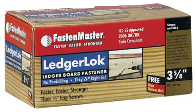Fastenmaster, 50 Pack, 3-5/8", Ledgerlok Screw, Ledgerlok Is Engineered To Attach The Ledger Board To The Rim Board Of A House Without Pre-Drilling, IBC/IRC Code Compliant ESR #1078,ACQ Approved. vendor ID: 75879 Price/Unit: 36.99EA model: FMLL358-50