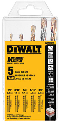 5 Piece, Multi Material Drill Bit Set, Carbide Split Point Tip For Maximum Sharpness, Aggressive Flute Angles For Faster Drilling Speed, No Spin Shank Eliminates Bit Slippage. vendor ID: 22426 Price/Unit: 21.99EA model: DWA56015