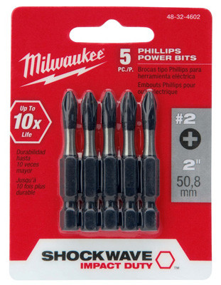 Shockwave, 5 Pack 2", #2, Phillips Insert Bit, Designed For Long Life In All Fastening & Impact Fastening Applications, Forged Tip For Maximum Grip, Geometric Design Provides The Shock Absorption, Proprietary Steel & Heat Treat Process For Maximum Strength & Durability, Skin Carded Packaging. vendor ID: 98327 Price/Unit: 5.99EA model: 48-32-4602