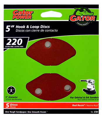 Gator, 5 Pack, 5", 5 Hole, 220 Grit, Aluminum Oxide, Red Resin, Sanding Discs, Designed Specifically For Power Tools, For Use On Wood, Metal, Drywall, Fiberglass & Painted Surfaces, Quick Change Hook & Loop Holding System Allows Faster Disc Changes, Fits Porter Cable Random Orbit Sanders, Resin Bonded To Resist Heat & Humidity For Longer Life, Vented Hole Pattern Matches Sanders Pad For Maximum Dust Extraction. vendor ID: 98244 Price/Unit: 3.49EA model: 3781