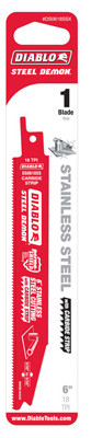 Diablo Steel Demon, 6", 18 TPI, Carbide Strip Stainless, Reciprocating Saw Blade, Offers A Pure Solid Strip Of Carbide For Its Cutting Edge, Carbide Strip Is Welded To The Blade Body, The Teeth Are Molded To Perfection For Longer Cutting Life, Stainless Steel Application. vendor ID: 98723 Price/Unit: 10.49EA model: DS0618SSX