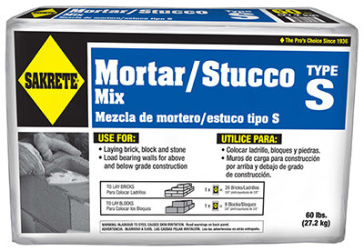 60 LB, Sakrete Type S High Strength Mortar Mix. A Quality Mixture Of Sand & Cement. For Laying Brick, Block & Stone. For Building Load Bearing Walls Above And Below Ground Level. For Tuck Pointing Mortar Joints & Stuccoing Walls, UPC: 7 64661 13160 1. vendor ID: 7451 Price/Unit: 7.49EA model: 65300024-RDC04