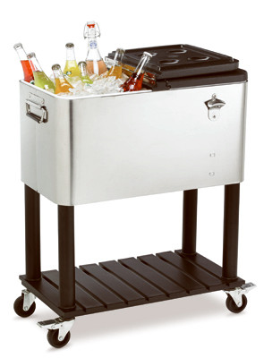 60 QT, Black, Stainless Steel Rolling Cooler, Steel Legs With Stainless Steel Body With Plastic Lid, Includes A Bottom Steel Slat Shelf, Can Fit 90 Cans, 28.66 LB, Assembled Dimensions: 25.59" x 17.71" x 35.5''. vendor ID: 75770 Price/Unit: 149.99EA model: L-BC243PST-AA