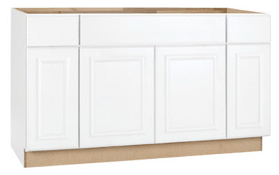 60"W x 34.5"H x 24"D, 60", White Finish, Assembled Sink Base Cabinet, Raised Panel Door Style, Full Overlay, 1/2" Thick End Panel, Accommodates Most Kitchen Sinks & Cooktops, Carb Compliant, Meets HUD Minimum Property Standards. vendor ID: 5939 Price/Unit: 314.00EA model: CBKSB60-SW