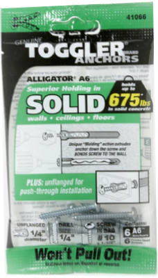 Toggler Alligator, 6 Pack, 1 /4" Diameter, A6 Flanged Solid Wall Anchors With 6 #10 x 1 1/2" Screws, Versatile & Easy To Install, Works In Any Building Material & Many Different Sizes & Types Of Screws Can Be Used With The Same Diameter Anchor, Replaces Plastic Plugs & Screw Anchors As Well As Metal Masonry Screws & Wedge Anchors, Out Holds Metal Anchors Of Comparable Size For A Fraction Of The Cost, Special Corrosion Proof Polymer Absorbs Shock & Vibration. vendor ID: 4086 Price/Unit: 2.99PKG model: 50460