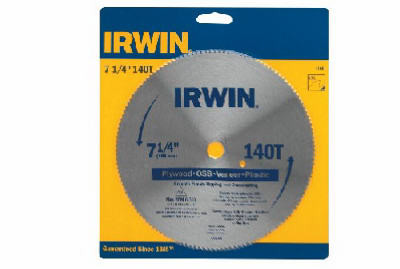 Irwin, 7-1/4", 140 Tooth, Steel Plywood Blade, Universal Arbor, Smooth, Clean Cutting In Plywood, Paneling & Veneer, Plastic & OSB. vendor ID: 1776 Price/Unit: 7.99EA model: 11840