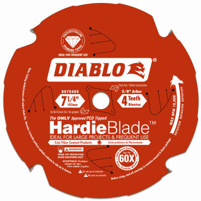 7-1/4" x 4 Tooth x 5/8 Arbor, Diablo Fiber Cement Blade, Polycrystalline Diamond Exclusive Hardie Endorsed. vendor ID: 98723 Price/Unit: 54.99EA model: D0704DH