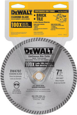7", Dry Cut Diamond Wheel, 5/8" Diamond Knock Out Arbor, For Cutting Brick, Block & Tile, Fast Shallow Cutting, Matrix Design Minimizes Chipping, Steel Body Delivers Constant Depth Of Cut & Advanced Diamond Matrix For Longer Life & Enhanced Material Removal, Lasts Up To 100 Times Longer Than Abrasive Blades, Used On 7" & 7-1/4" Circular, Worm Drive Saws, Carded. vendor ID: 22426 Price/Unit: 39.99EA model: DW4702