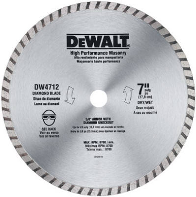 7", High Performance Masonry Blade, 5/8" Diamond Knock Out Arbor, For Cutting Brick & Masonry Material, Faster Cut Rate At Constant Depth & Minimizes Dust With Thinner Kerf, Lasts Up To 30 Times Longer Than Abrasive Blades, Use On 7" & 7-1/4" Circular Saws, Carded. vendor ID: 22426 Price/Unit: 19.99EA model: DW4712
