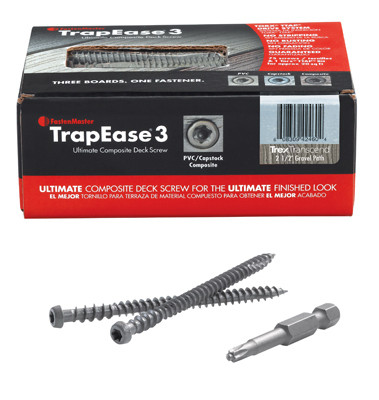 Fastenmaster Trap Ease 3, 75 Piece, Color Beach Dune, No Pre-Drilling, Designed For Cap Stock, PVC & Composite Decking, Torx Tap Drive System Offers Stick Fit & Wobble Free Installation, Virtually Eliminates Fastener Stripping During Installation Or Removal, UV Resistant Head Paint That Will Not Fade For The Life Of The Project Guaranteed. vendor ID: 75879 Price/Unit: 11.49EA model: FMTR3-212-75ENBD