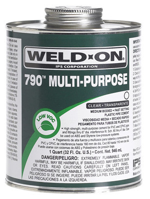 790, PT, Clear, Multi-Purpose, Low VOC Multi-Purpose Cement, Medium Bodied, Fast Setting, For All Classes & Schedules With Interference Fit Through 6", 160 mm, Diameter, Schedule 80 Through 4", 110 mm Diameter, High Strength Cement For PVC & CPVC Pipe & Fittings, Can Be Used On ABS & Styrene Low Pressure Systems. vendor ID: 4953 Price/Unit: 7.99EA model: 10258