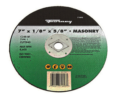 7" x 1/8", Masonry, Type 1, Cutting Wheel, 5/8" Arbor, Silicon Carbide & Dual Fiberglass Reinforced, Used Primarily On Ceramic, Masonry, Plastic & Other Non Ferrous Materials, Quality Made To Provide Fast, Safe, Dependable Service, Designed To Be Used On Right Angle Grinders Only. vendor ID: 13649 Price/Unit: 2.99EA model: 71893