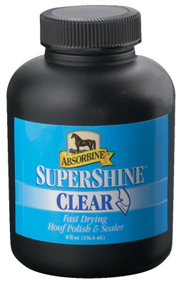 Supershine, 8 OZ, Clear, Hoof Polish & Sealer, Dries In Less Than 60 Seconds Giving Your Horses Hooves A Magnificent Mirror Like Finish, Quick Drying Formula Helps Prevent Dirt & Dust From Settling On The Show Winning Shine, Seals Out Excess Moisture To Harden Soft Hooves, Does Not Penetrate Beyond The Surface Of The Hoof Wall, So It Will Not Harm The Hoof, Rubs Off In A Week With The Horses Normal Activities In The Stall, Paddock, Or Pasture. vendor ID: 6173 Price/Unit: 12.99EA model: 429087