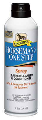 Horsemans One Step, 8 OZ, Leather Cleaner & Conditioner, Easy To Use Spray, Cleans & Conditions Leather & Synthetic Leather Products, Non-Aerosol Micro Spray Penetrates Crevices To Lift Out Dirt & Grime Without Dripping, Dries Fast, Tack Can Be Used Or Put Away Immediately, Fine Mist Provides Even Coverage & Sprays From Any Angle, For Easy Application, Preserves & Conditions Leather To Keep It Soft & Pliable, Protects Against Drying & Cracking, & Leaves A Beautiful Satin Sheen, All In 1 Easy Step. vendor ID: 6173 Price/Unit: 9.49EA model: 428321