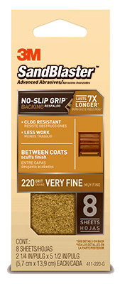 Sandblaster, 8 Pack, 2-1/4" x 5-1/2", 220 Grit, Gold, Flexi Grip Advanced Sandpaper Sheets, With No Slip Grip, Backing Is Perfect For Sanding Between Initial Coats Of Paint & Clear Coats Using Sharp Minerals & Strong Resins That Cut Fast & Last Long, The No Slip Grip Backing Gives You More Control. vendor ID: 38398 Price/Unit: 3.99EA model: 411-220-G