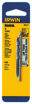 #8 x 32, National Course Thread, Tap & Drill Set, Carbon Steel, Ideal For Routine Maintenance, Repair Work & For Rethreading Where High Accuracy & Tolerance Thread Is Not Critical, Straight Flutes Are Ground To Provide Rapid Chip Removal For Efficient Threading, Designed For Hand Threading Work In A Variety Of Materials Taps Produce A Class 2B Thread, Includes #29 Drill Bit. vendor ID: 2864 Price/Unit: 4.79EA model: 80217