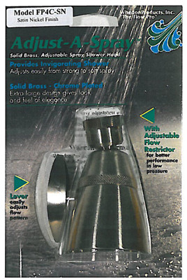 Adjust-A-Spray Elite, 2-1/4", Solid Brass, Nickel Finish Adjustable, Spray Shower Head, Adjusts From Forceful, Invigorating Shower To A Softer, Gentler Flow, Includes 5 Flow Rate System For Improved Performance In Low Pressure, Swivels For Easy Adjustment Of Spray Direction, Installs Easily With Standard 1/2" Female Threads. vendor ID: 7286 Price/Unit: 42.99EA model: FP4C-SN
