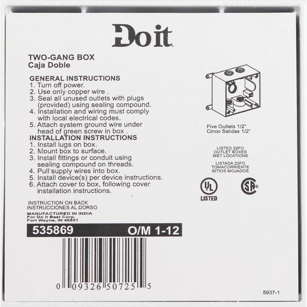 - Bell 2-Gang 1/2 In. 5-Outlet White Aluminum Weatherproof Outdoor Outlet Box Shrink Wrapped