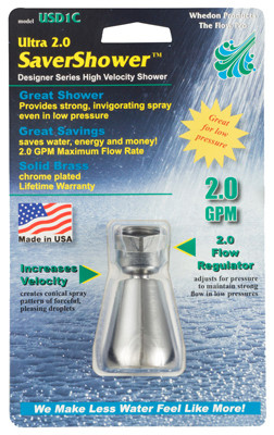 Savershower, Solid Brass, Chrome Plated, Standard Shower Head, Provides Invigorating High Velocity, Great For Low Pressure, Uses Only 2.0 GPM At Normal Pressure, Complies With Federal Codes, Alternate Spray Disc For Low Pressure Included, Satisfaction Guaranteed. Carded. vendor ID: 7286 Price/Unit: 9.99EA model: SS1C