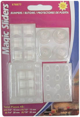 Magic Clear Sliders Bumpers, Prevent Movement On Hard Surfaces & Absorbs Sound, Includes a Total Of 48 Pieces Assorted: 12 Each Of 1/2" Round, 4 Each Of 7/8" Round, 6 Each Of 1/2" Square, 6 Each Of 3/4" Square & 20 Each Of 3/8" Round. vendor ID: 52019 Price/Unit: 6.79EA model: 78977