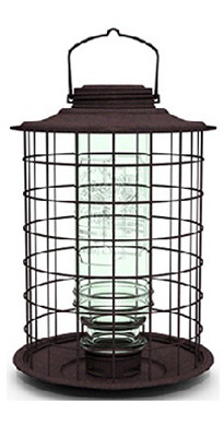 Caged Vintage Song Bird Feeder, Metal Cage & Glass Bottle Make This Feeder Resistant To Destructive Squirrels, Dark Brown Finish On Metal & Vintage Look Glass Bottle, Feeder Comes With A Thistle Ring To Convert The Feeder To A Finch Only Feeder. vendor ID: 5372 Price/Unit: 31.99EA model: 18