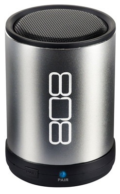 808 Canz, Silver Portable Blue Tooth Speaker, Big Sound, Rechargeable, Uses Lithium Polymer Battery, 500Mha, Battery Life, 2.5-3 Hours, Max Volume, 5-6 Hours, Normal Volume, Supports Bluetooth V2.1 Profile A2DP, LED Pairing Indicator, Pairing Button, 3.5 mm Audio Line Input, Wireless 30' Range, Output Power: 2W x 1, Includes Speaker, 2' USB Charging Cable, Aux In Cable 8". vendor ID: 95869 Price/Unit: 39.99EA model: SP880SL
