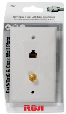 Cat5/6 Coax Wall Plate, Terminates In Wall Cat5/Cat6 Installations, Covers Wires Coming Into A Mounted Electrical Box, Install Wall Plate With Screws & Attach Cables To Front Of Plate, Single Cat5/Cat6 & Dual Coax Connections. vendor ID: 95869 Price/Unit: 5.99EA model: TPH557R