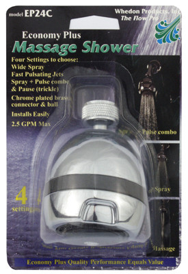 Chrome, Economy Plus Massage Shower Head, With 3 Setting, Fast Pulsating, Hard Shower Spray Or Combination Spray & Pulse, Turn Crown To Change Sprays, Chrome Plated Brass Ball & Connector, Chrome ABS Spray Body, 2.5 GPM Maximum Flow Rate, Installs Easily With Standard 1/2" Female Threads. vendor ID: 7286 Price/Unit: 13.99EA model: EP24C