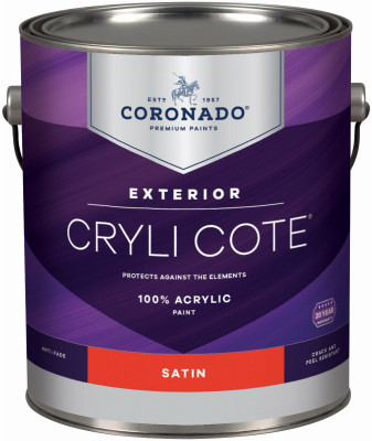Coronado Cryli Cote, Gallon, Satin, Deep Base, 100% Acrylic Exterior Paint, Durable, Professional Finish, Good Color Retention, Can Be Applied Down To 38 Degrees, Self Priming On Many Surfaces, Mildew & Blister Resistant, Coating, Clean Up Warm, Soapy Water, VOC Less Than 100, Approximate Coverage 350-450 SQFT Per Gallon. vendor ID: 8519 Price/Unit: 45.99EA model: 410.34.1