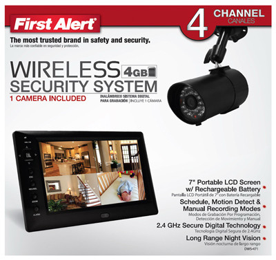 First Alert, Digital Wireless Recording System, With 7" LCD Display, Supports Up To 4 Cameras With A Wireless Range Of 500', Built In Display Lets You Monitor & Record Up To 4 Different Locations In Clear Color Video, Includes Manual Recording, Motion Detection Recording & Alarm Activated Recording, Comes With 1 Dwc-400 Indoor/Outdoor Camera With Night Vision, But More Cameras Can Be Added For Extra Security, Keeps Your Family & Valuables Protected Without Dealing With The Hassle Of Wires. vendor ID: 36996 Price/Unit: 299.99EA model: DWS-471