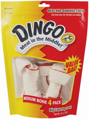 Dingo, 4 Pack, Medium, White, Rawhide Bone, Premium Hand Tied Rawhide Bone With The Irresistible Combination Of Real Chicken Breast Jerky Wrapped In The Highest Quality Rawhide, Helps Promote Healthy Teeth By Preventing Tartar Build Up, Value Pack. vendor ID: 8235 Price/Unit: 14.99EA model: P-95007