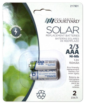 Four Seasons Courtyard, 2 Pack, 2/3 "AAA" Solar Battery, 1.2V, 150 Mah. vendor ID: 7030 Price/Unit: 2.99EA model: 830-1901