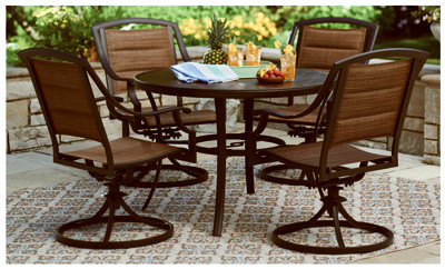 Four Seasons Courtyard, 5 Piece, Byron Bay Dining Set, Includes 4 Byron Bay Swivel Rockers, Steel Frame, Padding Sling Back, Rust Inhibiting Electro-Coating Powder Finish, Frame Is First Sealed With An Electro-Coat To Provide Powerful Rust Resistance, Then Covered With A Rich Brown Powder Coat, Chair Features Maintenance Free Sling Fabric That Dries Quickly & Is Easy To Clean & 1 Byron Bay Round Dining Table, Steel Frame, Rust Inhibiting Electro-Coating Finish, Hand Painted Glass Top Table, Rocker Assembled Dimensions: 26.57"L x 23.43"W x 37.80"H, Table Assembled Dimensions: 41.54"L x 41.54"W x 28.35"H. vendor ID: 7754 Price/Unit: 499.00EA model: 721.057.000