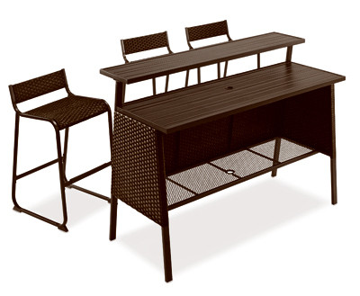 Four Seasons Courtyard, Concord, 4 Piece, Bar Set, Includes 3 Bar Stools With Comfortable Lumbar Support Back Rests & Foot Rests, Varying Width 2 Tier Steel Slat Bar Surface Is Generously Sized, Hand Wove All Weather Wicker Accent Both The Stools & Bar, Built With Durable Steel Frames With Rust Resistant E-Coating & Baked On Dark Brown Frame Finishes, Stools 19.3"L x 18.9"W x 35.8"H, Table 58.1"L x 26.6"W x 44.1"H, 250 LB Weight Capacity, Limited 1 Year Warranty, Steel 60%, PE Wicker 20%, Glass 20%. vendor ID: 7754 Price/Unit: 399.00EA model: 720.108.000