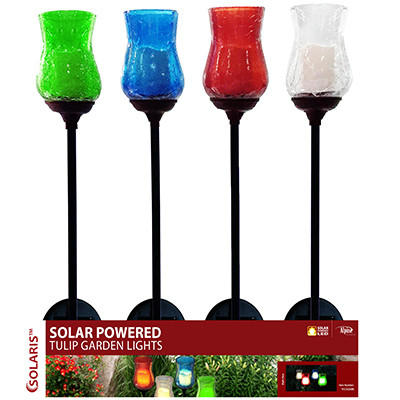 Four Seasons Courtyard, Solar Tulip Garden Stake, Light Up Your Lawn With These 4 Lumen Tulip Solar Light Stakes, A Candle Shaped LED Light Shines & Flickers Through A Beautiful, Crackled Tulip Shaped Shell Which Comes In A Variety Of Colors, A Solar Panel Provides Up To 8 Hours Of Power On A Full Charge, Photo Cells That Detect Light Activate The LED Automatically At Night For Hassle Free Operation, Assorted Tray Pack. vendor ID: 7033 Price/Unit: 9.99EA model: YCC161ABB