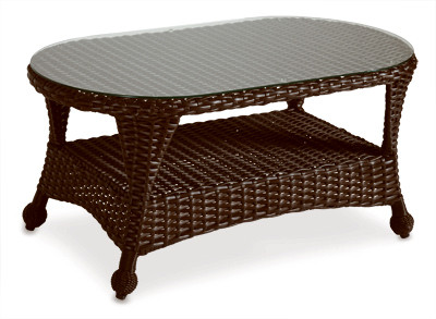 Four Seasons Courtyard, Wilmington Collection, Coffee Table With Glass Included, All Weather Mahogany Colored Resin Wicker On Powder Coated Steel Frame, Glass Is Tempered For Strength, 40" x 22' x 18". vendor ID: 1837 Price/Unit: 219.00EA model: 3332-003-129-02