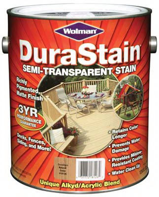 Durastain, Gallon Semi-Transparent Natural Cedar Wood Stain, Unique Alkyd/Acrylic Blend, Nationally VOC Compliant, Premium Performer in Durability, Color Longevity & Ease of Use, Fast Drying, Deep Penetrating, Ideal for Decks, Fences, Siding & Other Exterior Wood Surfaces. vendor ID: 51680 Price/Unit: 28.99EA model: 252585