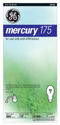 GE, HR175A39-22, 175W, Clear, Mercury Vapor Light Bulb, ED28 Shape, Maximum Overall Length 8-1/4", Commercial/Industrial, Mogul Base, 7950 Lumens, 24,000+ Hours. vendor ID: 18655 Price/Unit: 13.99EA model: 26440