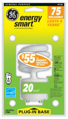 GE, FLE20HT3/2GU24CD, 20W, Compact Fluorescent Light Bulb, Equivalent To 75W Incandescent, GU24 Base, MOL:4.70, 10,000 Hours Rated Life, 1,200 Lumens, 2700 Color Temperature, CRI=70, Energy Start Rated. vendor ID: 18655 Price/Unit: 8.99EA model: 76136