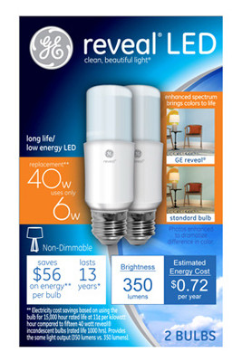 GE, LED6LS/RVL2PKOT, 2 Pack, 6W, Tubular, LED Bright Stik, Non Dimmable, Medium Base, Lumens = 450, Color Temperature = 2850, Equivalent To A 40 W Incandescent, MOL: 4", Rated Life, = 15,000 Hours Reveal Filters Out Dull Yellow Rays Providing A Crisp White Light, Non Energy Star, Boxed. vendor ID: 18655 Price/Unit: 9.99EA model: 36455