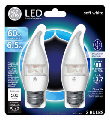 GE LED7DCAM-W3/TP2P, 2 Pack, 7W, Frosted, Candle Shape LED Bulb, 500 Lumens, 2700K, Medium Base, Dimmable, Equivalent To A 60W, 13.7 Years Rated Life, MOL: 4.12", Energy Star Compliant, Carded. vendor ID: 18655 Price/Unit: 12.99EA model: 17842