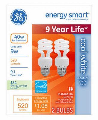 GE, 2 Pack, FLE9HT3/41HHBX2, 9W, Cool White, Compact Fluorescent Spiral Bulb, 520 Lumens, 4100 Kelvin, 9.1 Years Rated Life, 4.4" MOL, Medium Base, Instant On, Boxed. vendor ID: 18655 Price/Unit: 9.99EA model: 63923